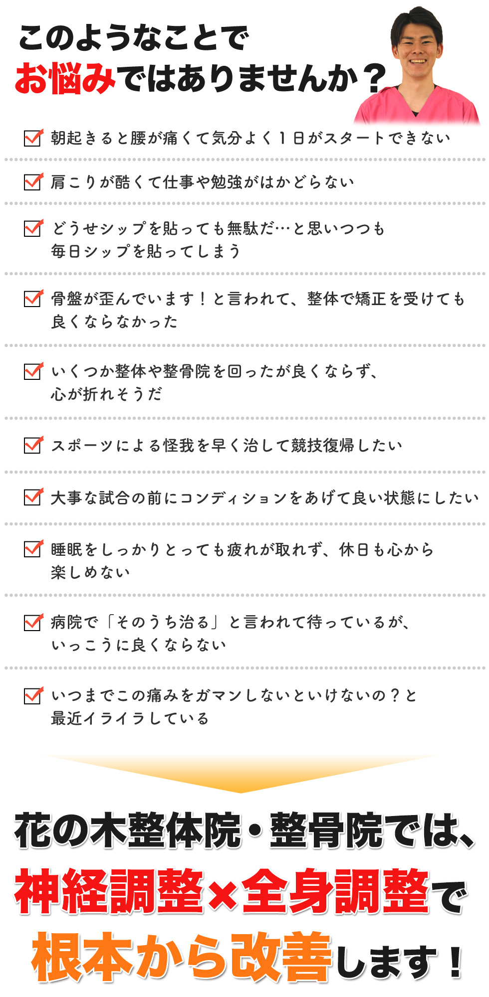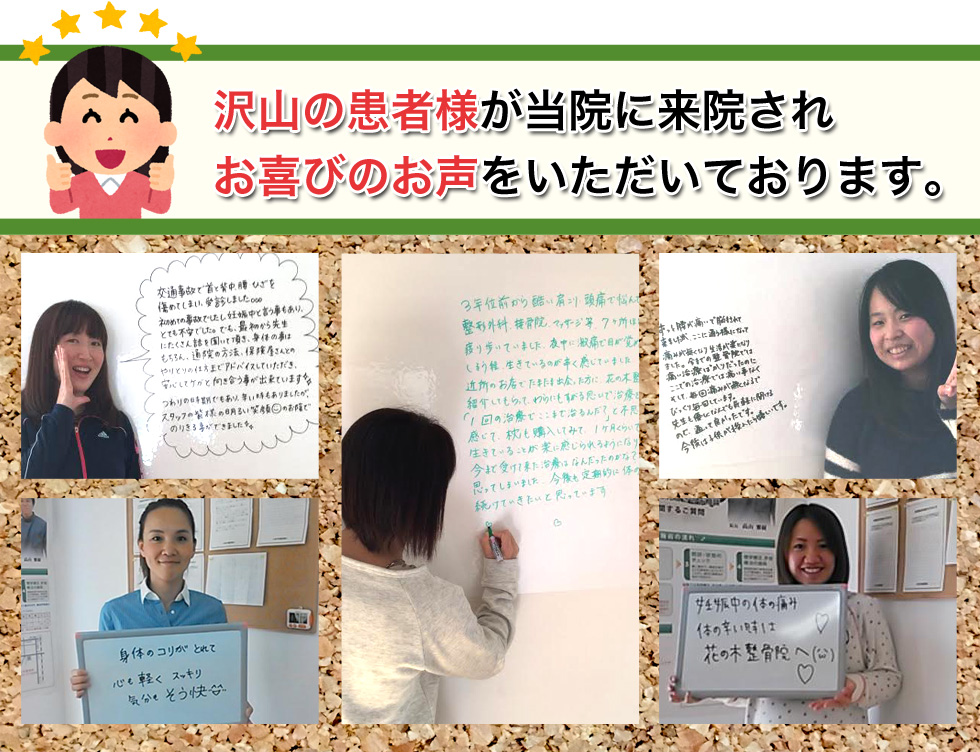 そして、まだまだたくさんの悩みを抱える方がいらっしゃるはずです。 あなたが諦めない限り、私たちも諦めません。 花の木整体院・整骨院を頼ってください。