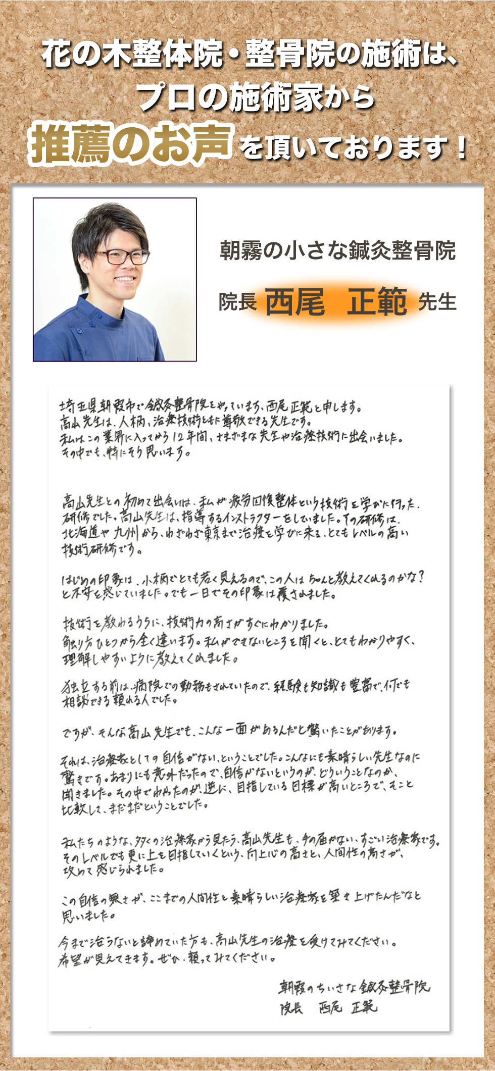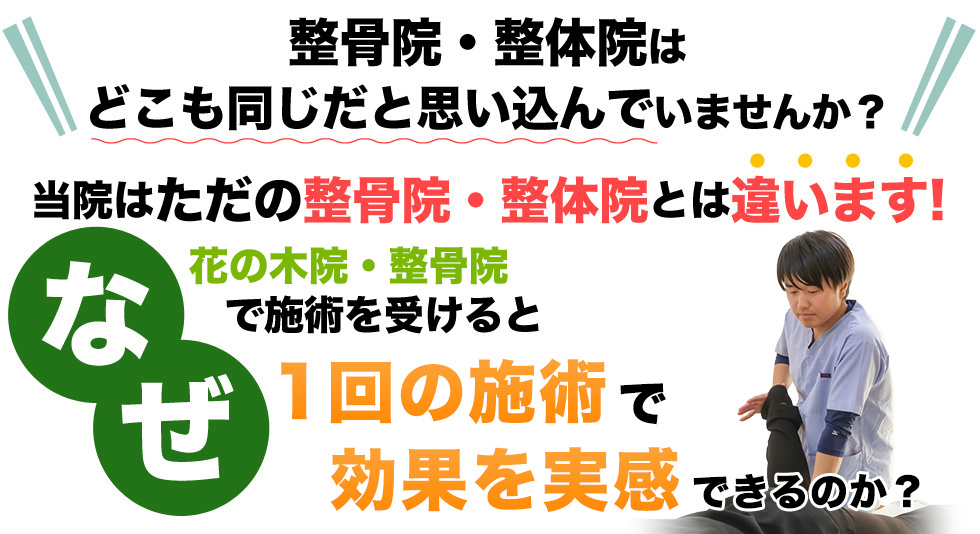 花の木整体院・整骨院の木村です。 当院では、急性痛・慢性痛への整体、スポーツ障害への整体、マタニティ産後への整体など様々な悩みに対して施術を行っています。