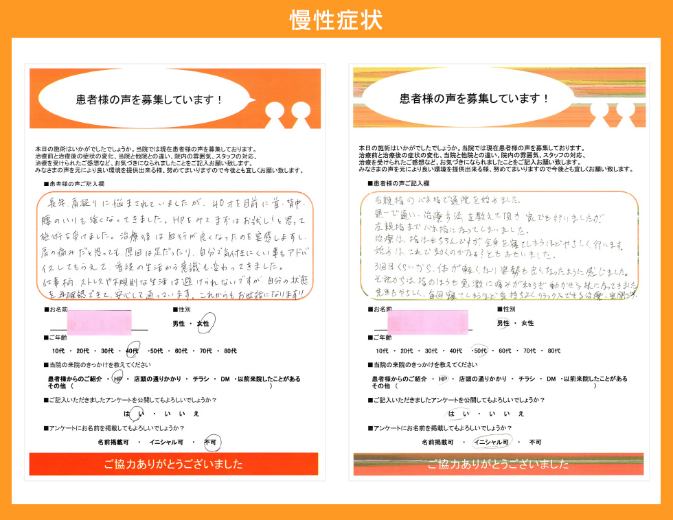 当院は自費診療の整体院のため、重症の方や長年症状を抱えている方、何箇所もリハビリや治療を受けた後に当院を訪れる方がとても多いです。