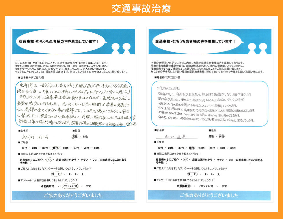 当院は国家資格を有した治療家が交通事故治療を担当しますので交通事故の保険を適用して施術を行わせて頂くことが可能です。